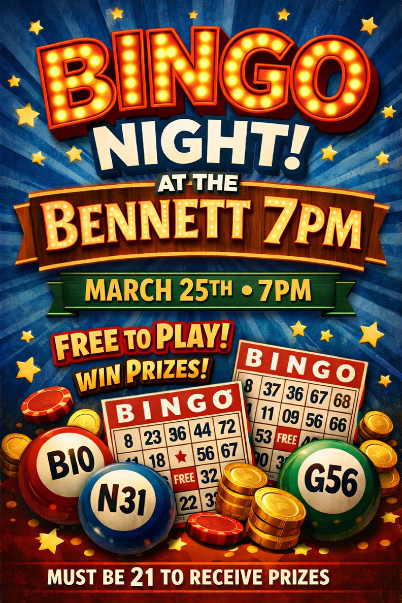 Join us for a fun-filled night of Bingo on April 8th at 7PM at the Bennett Pad! It’s free to play — and each beer purchase gets you a Bingo card, so the more you sip, the more chances you have to win.