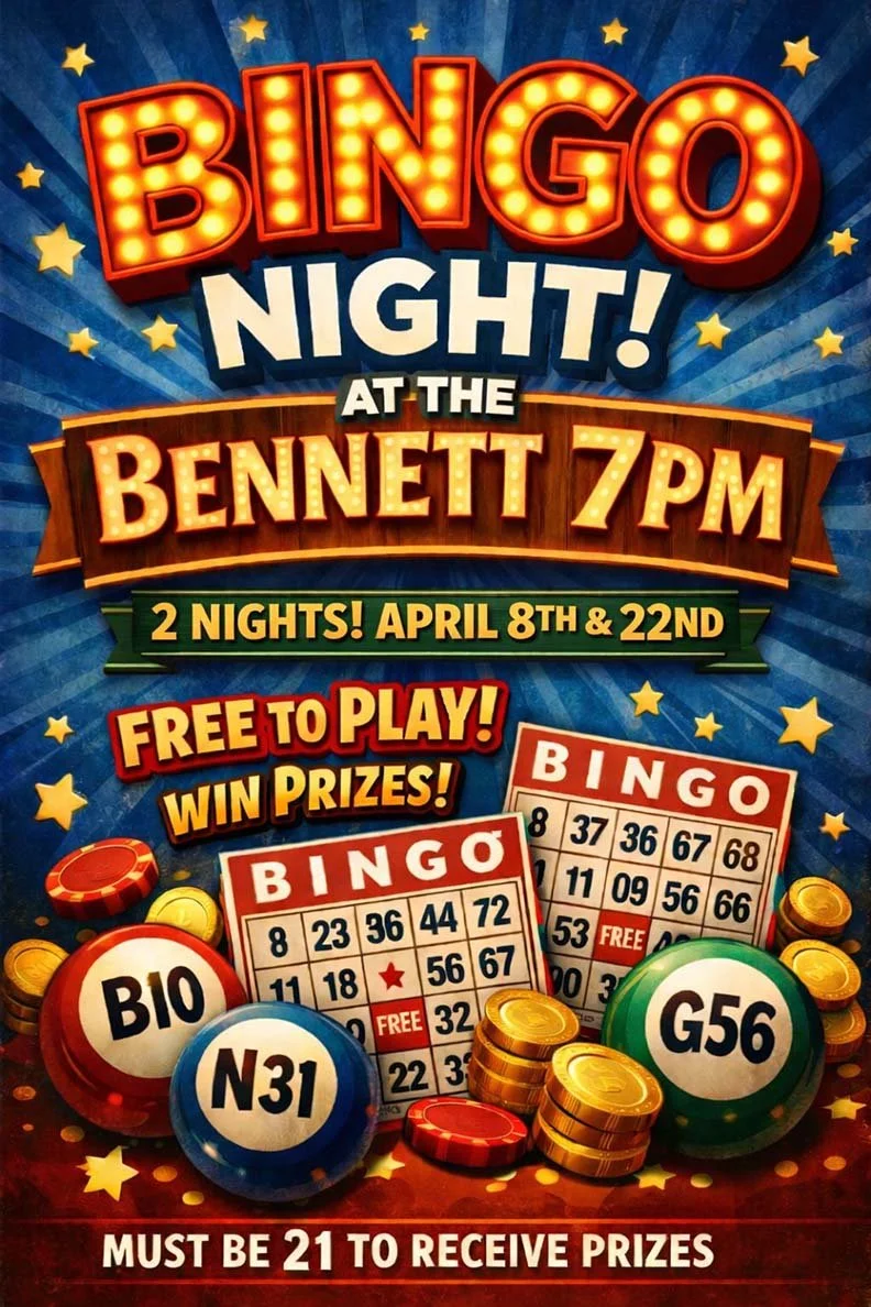 Join us for a fun-filled night of Bingo on April 8th at 7PM at the Bennett Pad! It’s free to play — and each beer purchase gets you a Bingo card, so the more you sip, the more chances you have to win.