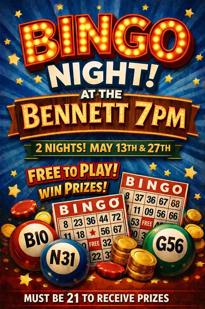 Join us for a fun-filled night of Bingo on May 27th at 7PM at the Bennett Pad! It’s free to play — and each beer purchase gets you a Bingo card, so the more you sip, the more chances you have to win.