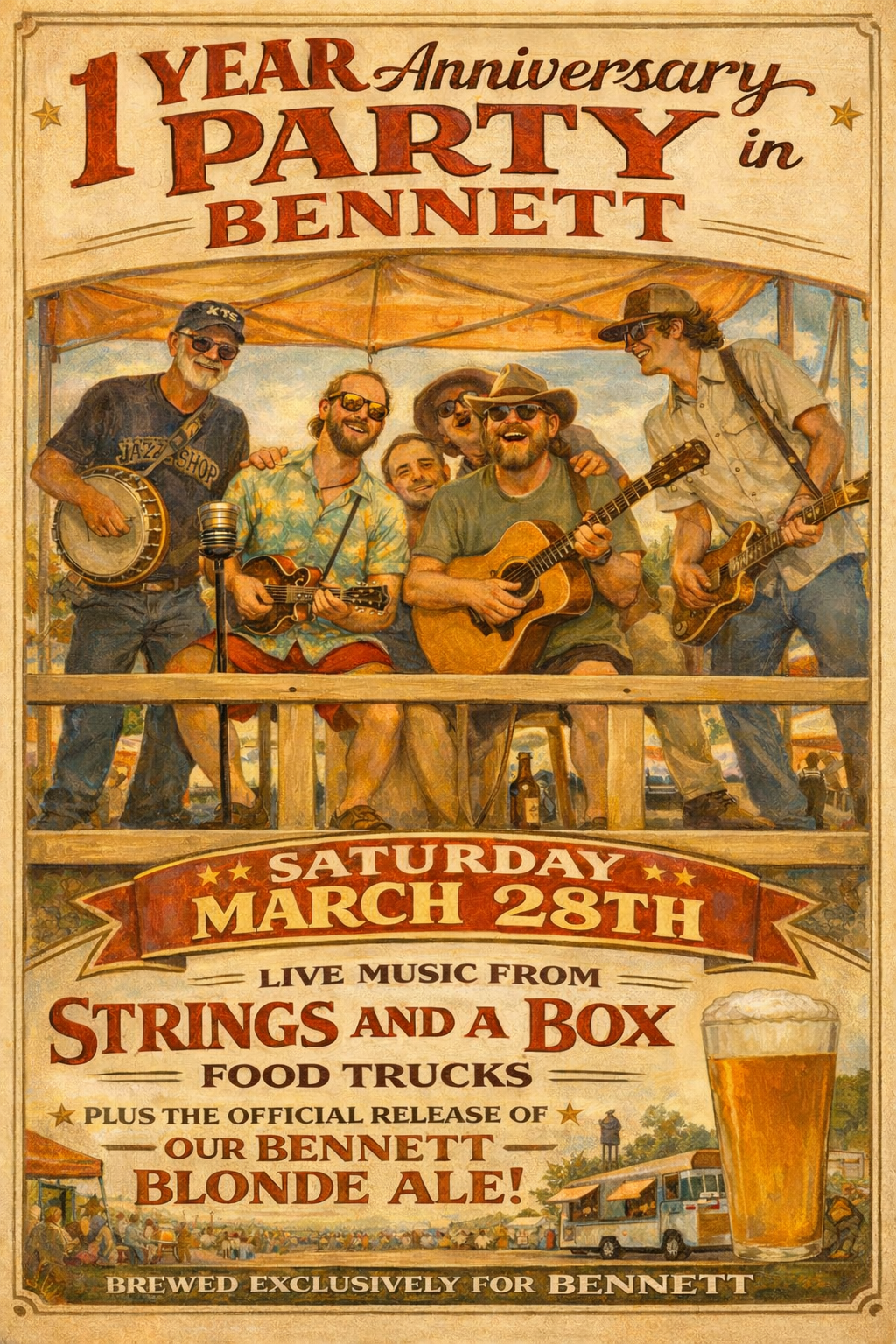 We’re throwing an anniversary party packed with everything you love—live music from Strings and a Box, delicious food trucks, and the official release of our Bennett Blonde Ale, brewed exclusively for our Bennett community.