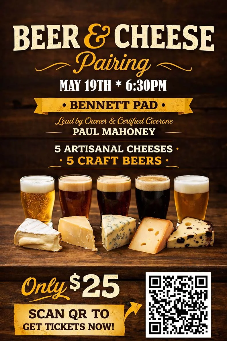 Join us in Bennett for a guided Beer & Cheese Pairing with Owner & Certified Cicerone Paul Mahoney. Enjoy 5 craft beers paired with 5 artisanal cheeses for just $25. Tuesday, May 19th at 6:30pm. Limited seats — grab tickets now! Tickets on sale starting April 1st