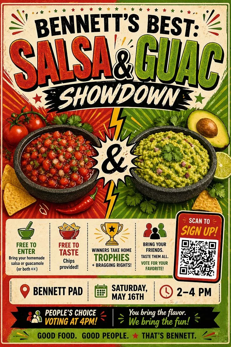 Join us for Bennett’s Best: Salsa & Guac Showdown on Saturday, May 16th from 2–4pm at the Bennett Pad! Whether you’re competing or just coming to taste, this is one of our favorite community events of the year.