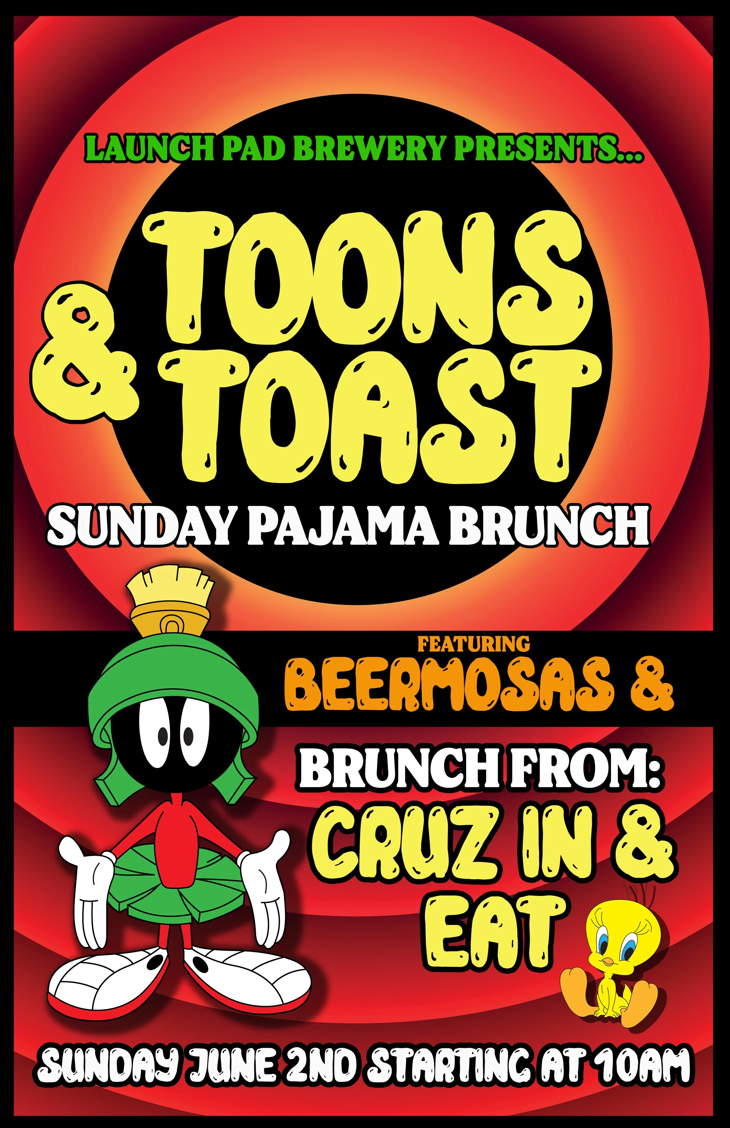 Get ready for a cozy morning at our Toons & Toast Pajama Brunch! Wear your favorite PJs and join us for a laid-back, fun-filled event featuring classic cartoons on the TV screens. Indulge in delicious brunch bites from Cruz in & Eat, and don't forget to try our refreshing Beermosas for a twist. It's a casual, nostalgic, and tasty way to start your day!