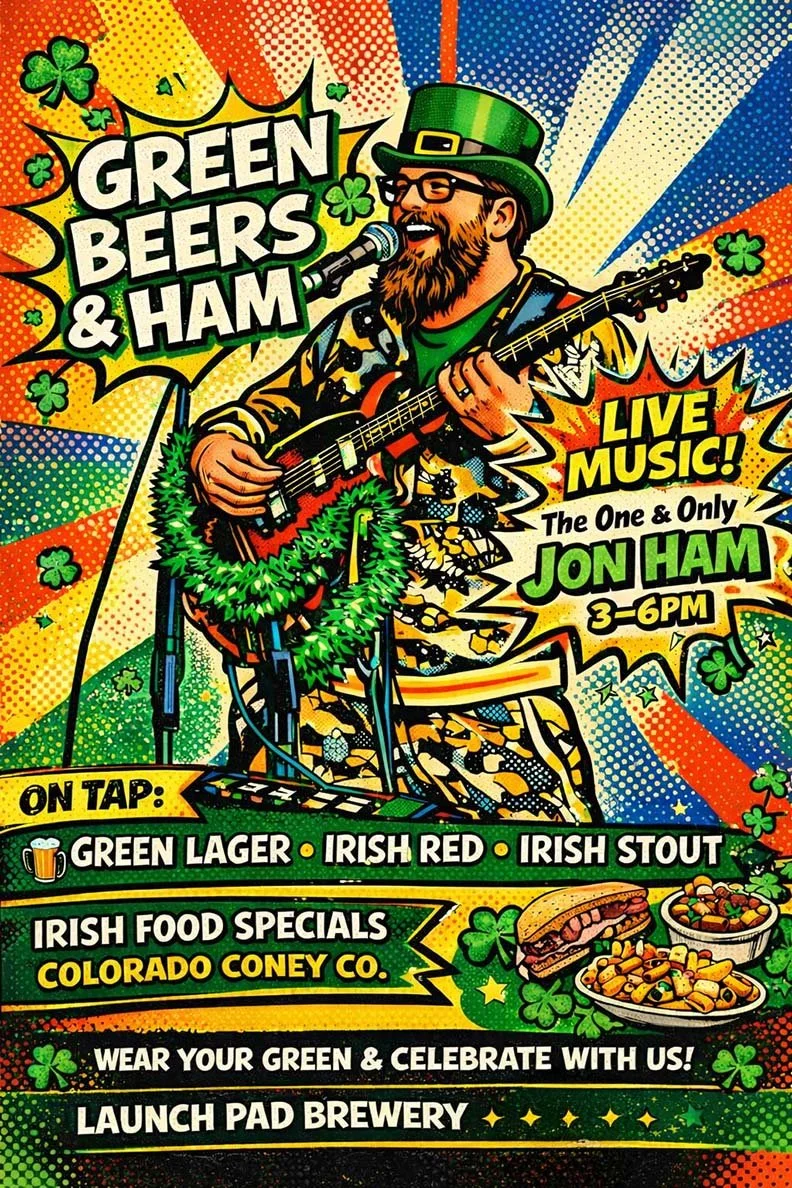 Green Lager, Irish Red Ale, and Irish Stout will be flowing, and Colorado Coney will be here serving up Irish food specials