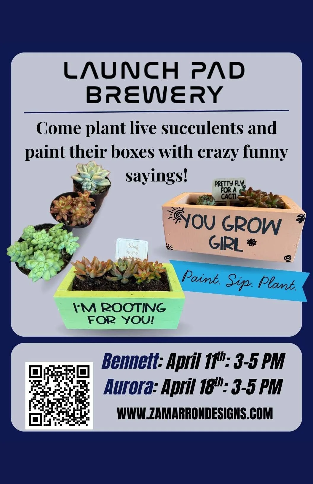Get ready to unleash your inner artist! Join Zamarron Designs at Launch Pad Aurora for a fun, hands-on experience where you'll paint your own custom wood plant holder and pot aN adorable baby succulent to take home. Choose from a curated selection of sayings to personalize your creation, then watch your little green friend thrive in its one-of-a-kind home. Multiple dates available—grab your spot and let the creativity flow!