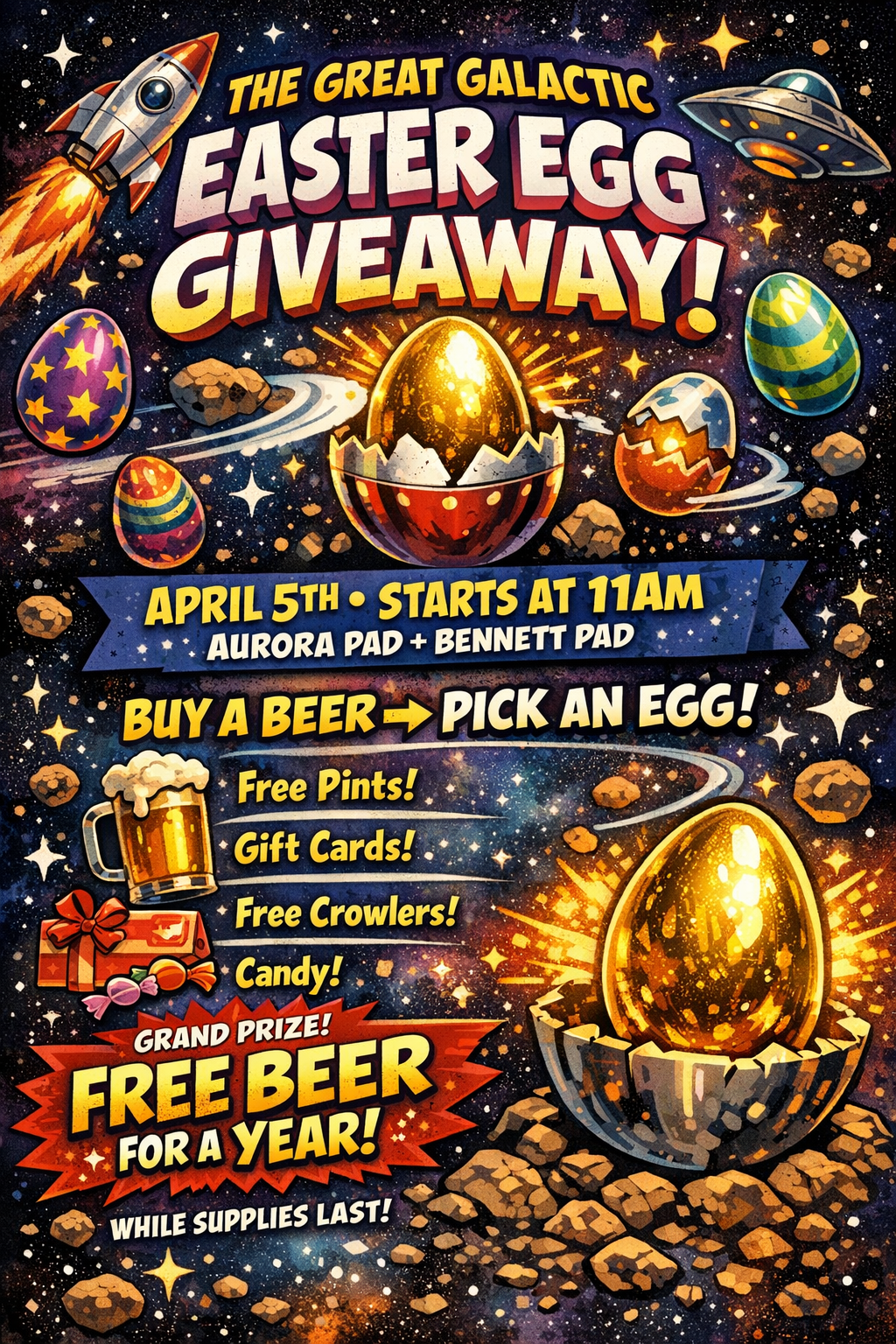 With every beer purchase, you’ll get to pick a mystery egg packed with prizes—from candy and free pints to gift cards, crowlers… and even FREE BEER FOR A YEAR.